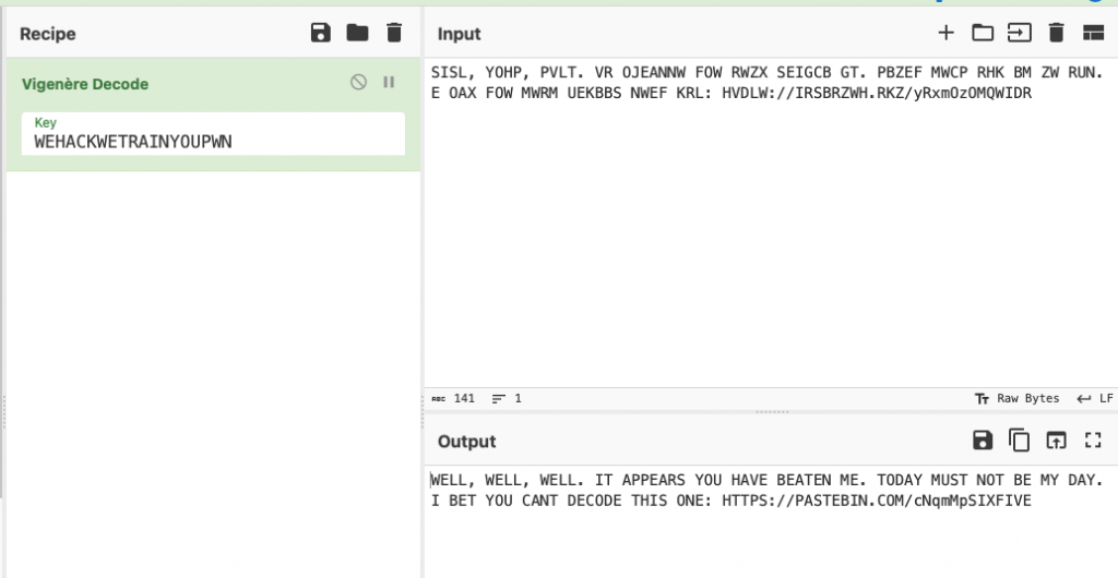 Having decoded the binary back to ASCII, we will receive a pastebin link. From here you will be presented with a lovely poem (thoughtfully written by ChatGPT) and some sort of encrypted text. By its intention and design it’s pretty easy to see it is a cipher, from the HVDLW://IRSBRZWH.RKZ/yRxmOzOMQWIDR which appears to follow the structure of a URL. However “HVDLW” cannot be a simple shift otherwise VD would be the same letters being that it comes from TT, if we assume its HTTPS. This rules most basic ciphers like Caesar and ROT13.