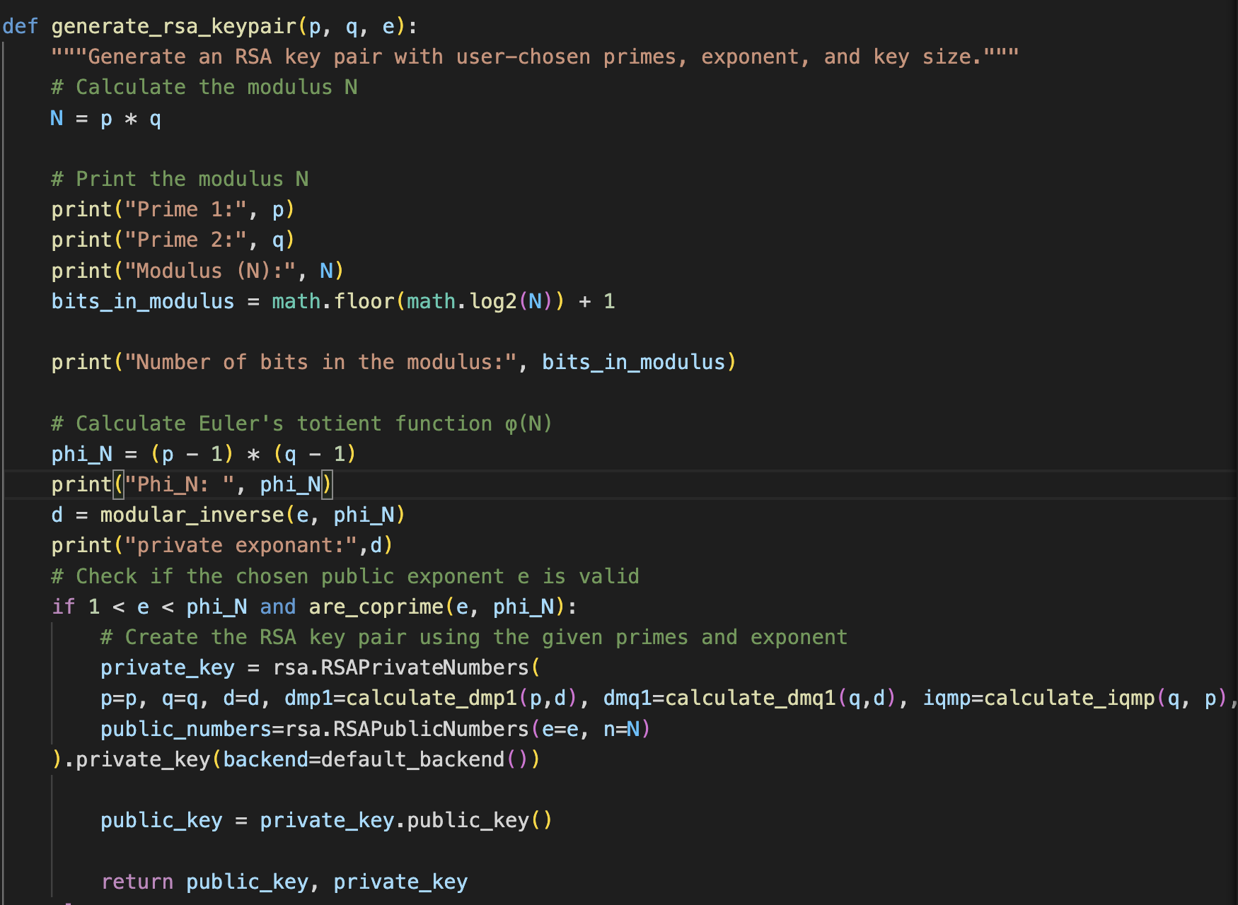 This was the trickiest part as it is computationally difficult to find the the two prime numbers. I used sympy’s factorint function which returns “a dictionary containing the prime factors of n as keys”.