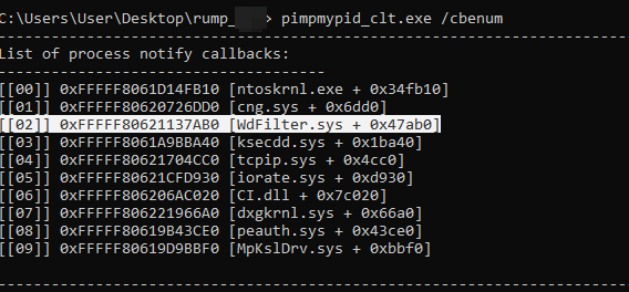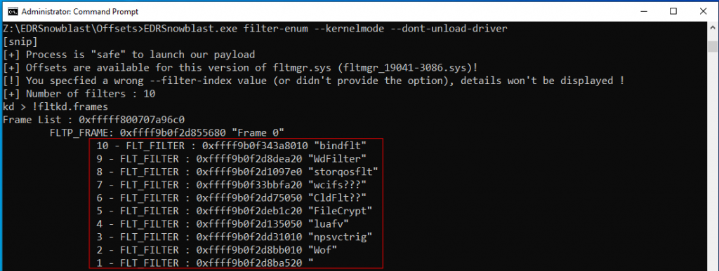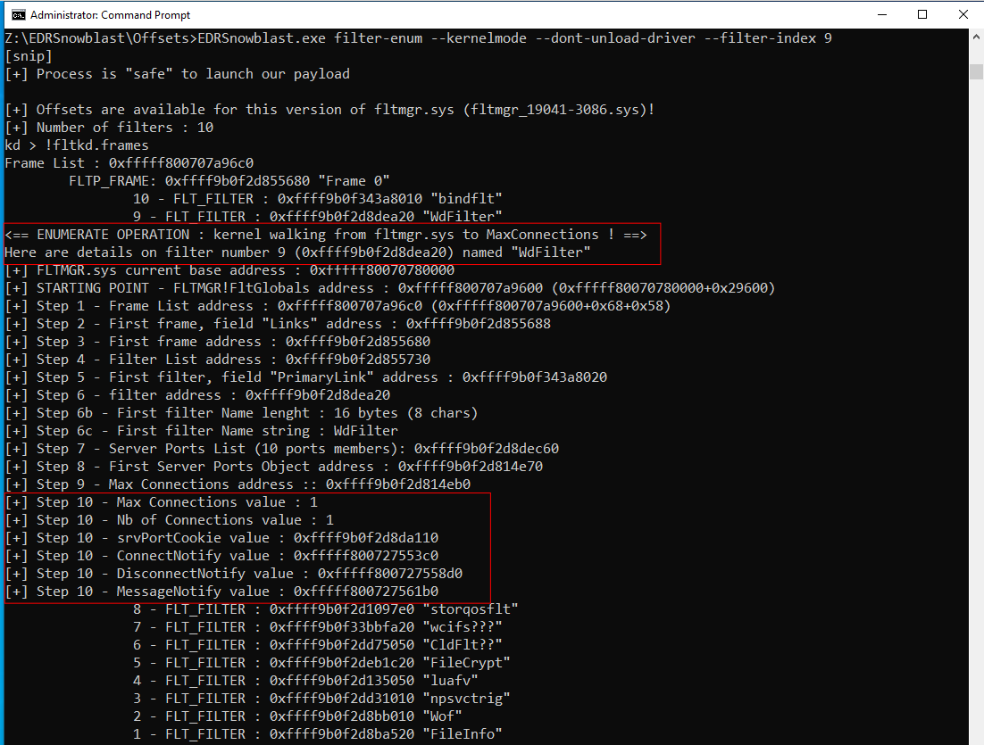 EDRSnowblast.exe filter-enum --kernelmode --filter-index 9