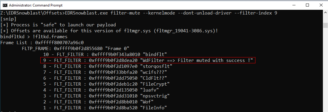 EDRSnowblast.exe filter-mute --kernelmode --filter-index 9