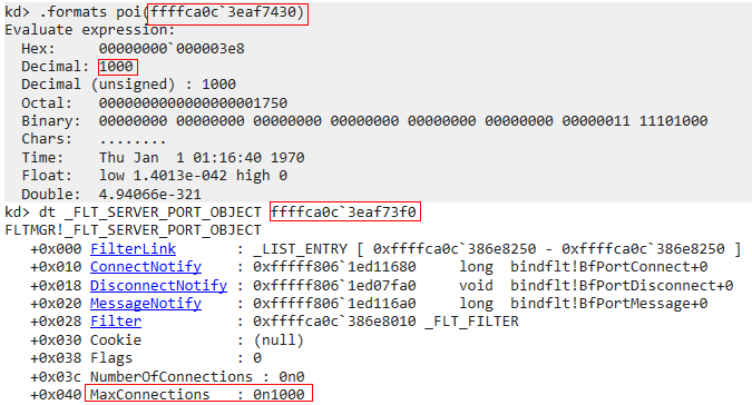 I agree with Alex Ionescu when he said “I got 99 problems but a kernel pointer ain’t one” :-). We can find MaxConnections address by walking through Windows kernel data structures, starting from FltMgr.sys driver up to this field!