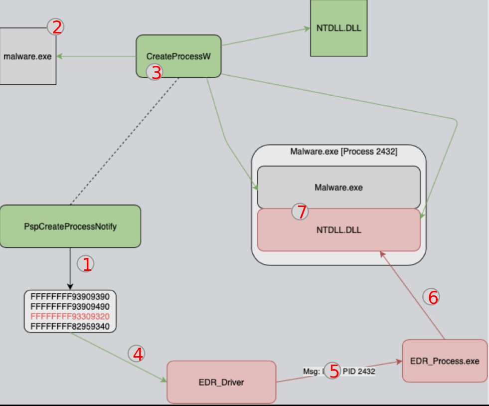 - EDR_Driver.sys sends a log to EDR_Process.exe saying “Hey! A new process called malware.exe will be started soon.”