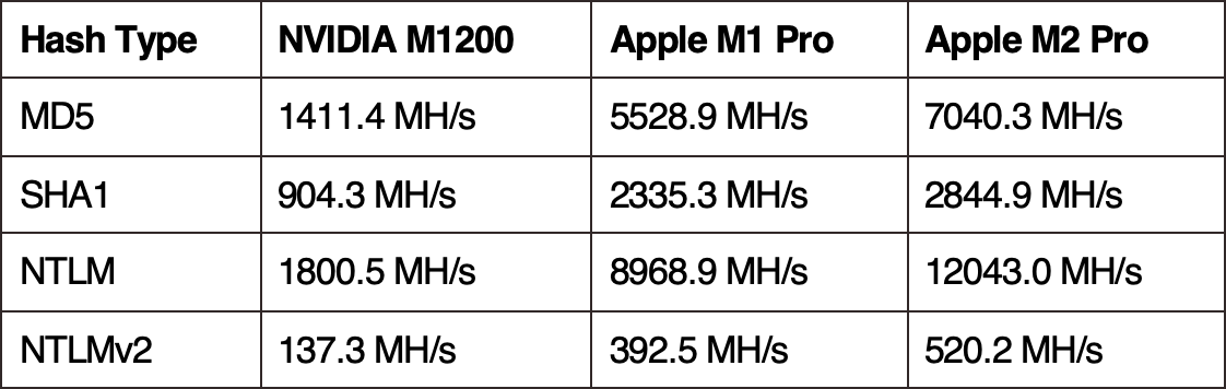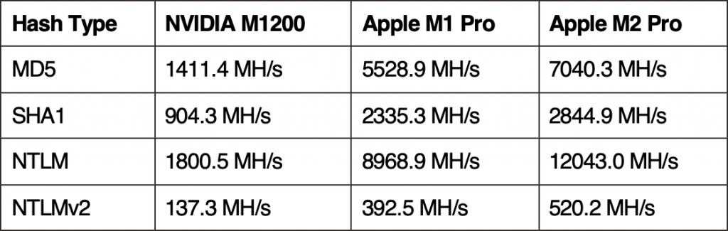 Let’s take some commonly used hash types to compare. Note, the M1200 used about 55W from the wall during benchmarking, and the M1 Pro used about 25W.