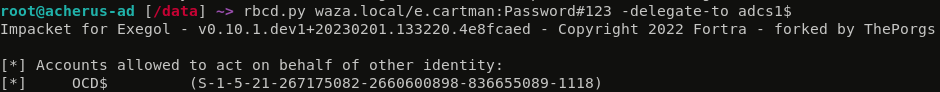 Another strange behaviour relates to Kerberos Delegation. Normally, when a user is in the Protected Users group, they cannot be delegated. Here I’m trying to abuse a RBCD delegation scenario from OCD$ to ADCS1$ to get a service ticket first as pu_user, which is a Protected Users, and second as not_pu_user, which is not. First, lets take a look at the delegation: