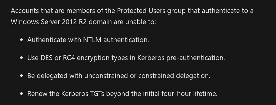 The “Protected Users” group was introduced in Windows Server 2012R2. If we take a look at the MSDN article we can see that users in this group have hardened security options: