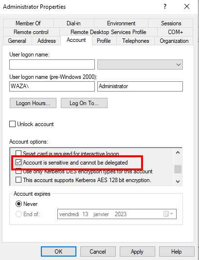 As you can see, NTLM authentication is disabled, the RC4 algorithm cannot be used to cipher the timestamp for Kerberos authentication and finally, Kerberos delegation is disabled. Let’s test this.