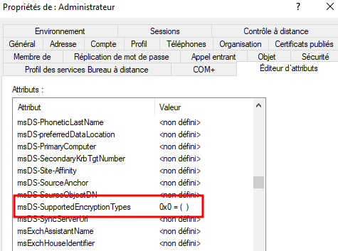 If we take a look at the attributes of the RID500 account we can see that the ms-DSSupportedProtocolEncryption value is set to 0x0