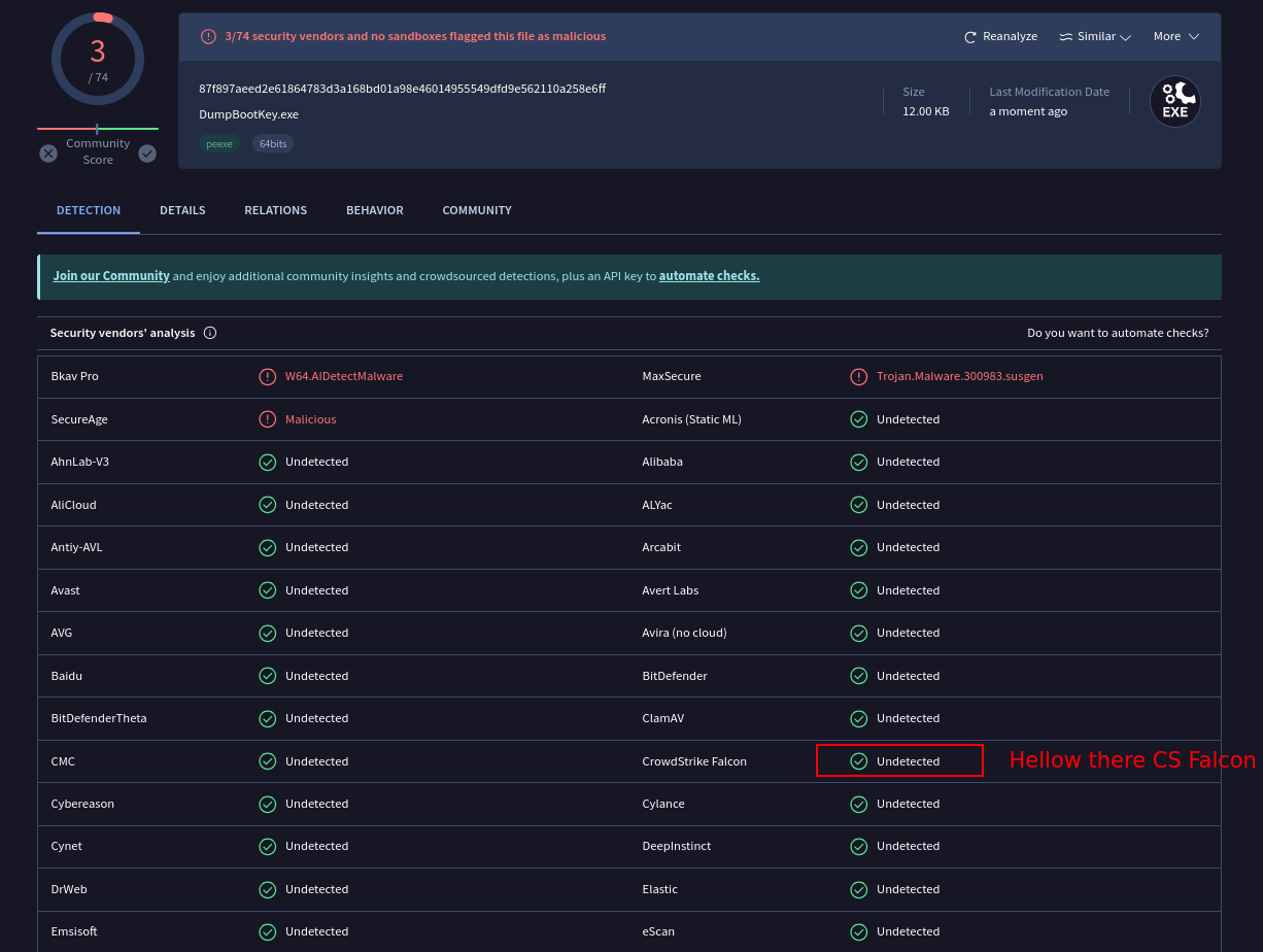 Two things are important with this binary. First you don’t need NT SYSTEM privileges to get the values (which is a pretty huge prerequisite). Second, you may think that reading these values is flagged/blocked by AV/EDRs… But it’s not: