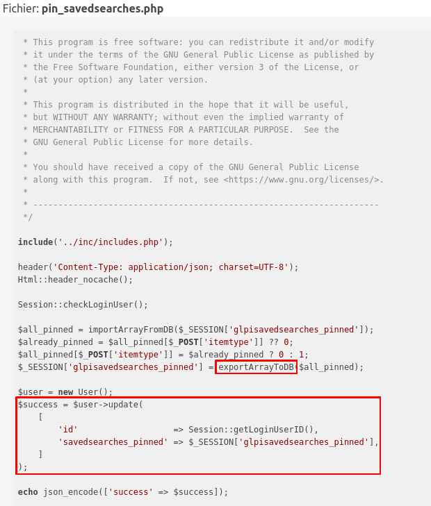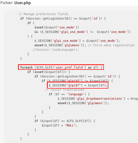 With user_pref_field defined in inc/define.php, it contains the savedsearches_pinned field that we need to store our payload. Before it was possible to exploit this by using the $_POST variable. However, it is not possible to poison this variable anymore, so we need to update this value in the database directly as shown in the Session::init method, and the savedsearches_pinned field will help us get there.