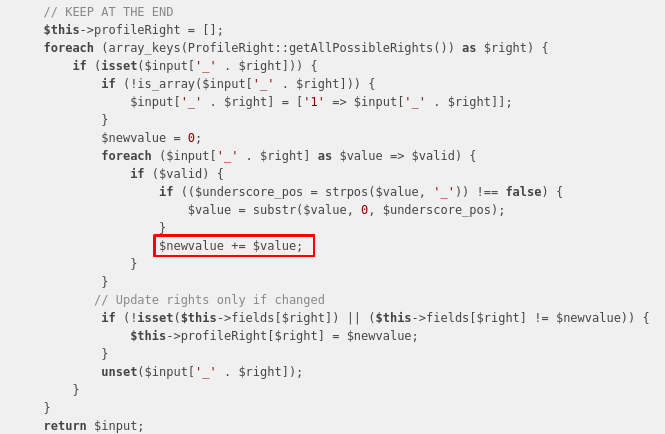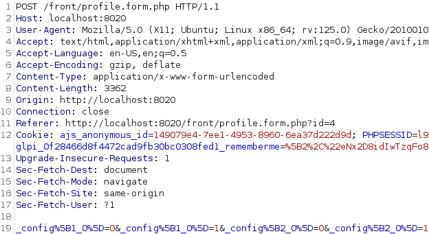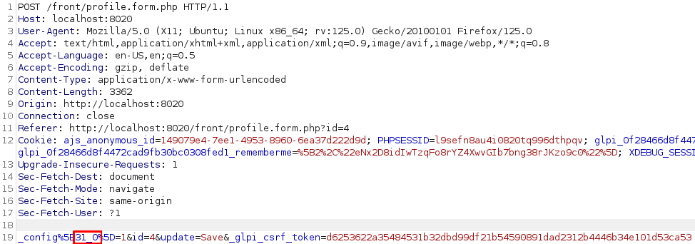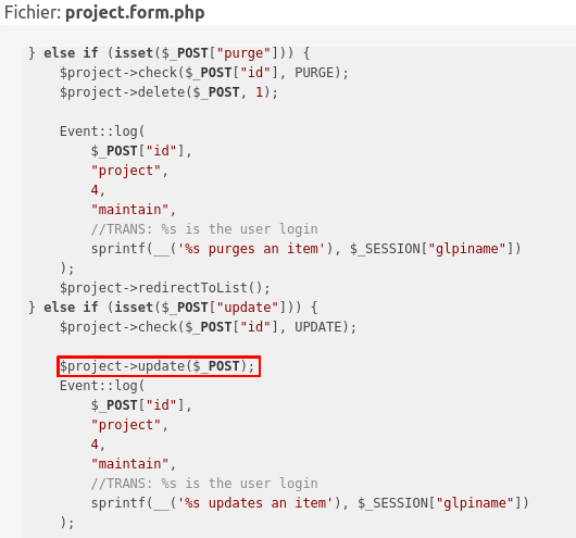 As shown above, the Setup row (which correspond to the config rightname is locked for any other rights than Read and Update). But because we already saw a Mass Assignment vulnerability in GLPI, why not try it again. Moreover here is the code responsible for updating profile rights (again update with a Superglobal):