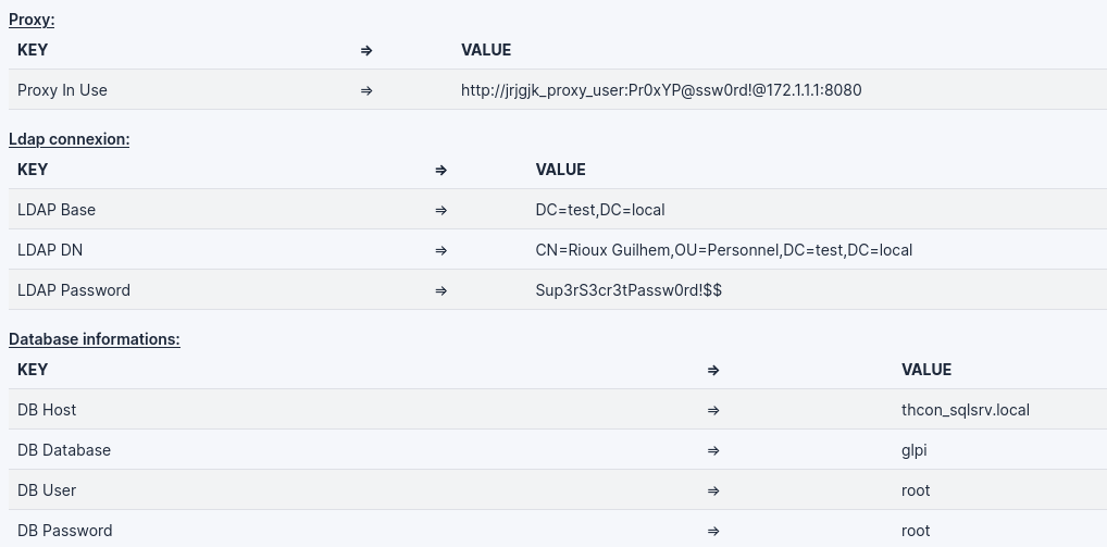 Obviously creating a dedicated web shell is not necessary, but it can be useful on GLPI to access some hidden variables. As said previously, this application is often bound to Active Directory through LDAP. So an account is used that sometimes has privileges. In this case, it is actually nice to gather those credentials. Also, GLPI might require internet access in order to check for updates or install plugins through the marketplace. A proxy can be set up with credentials to access the web.