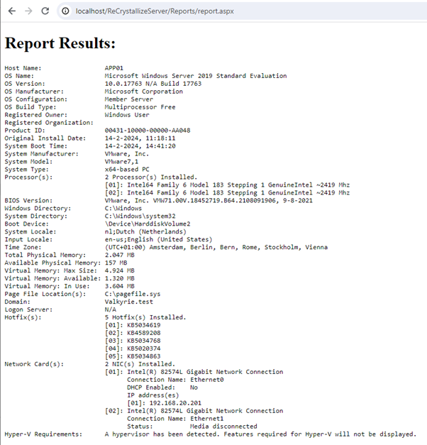 Let’s have a look at what could be important. Based on this information we know that the application runs on the system drive (C:). This is useful to know for command execution payloads or Local File Inclusion (LFI) vulnerabilities. The process is running as ‘NT AUTHORITY\SYSTEM’, which is a local account with the highest privileges. We also now know where ReCrystallize Server is installed and therefore would be able to find out where files are going to be stored. In this example you are also able to see that the server is domain joined (no this is not a client domain as I made an effort to set up a lab environment).