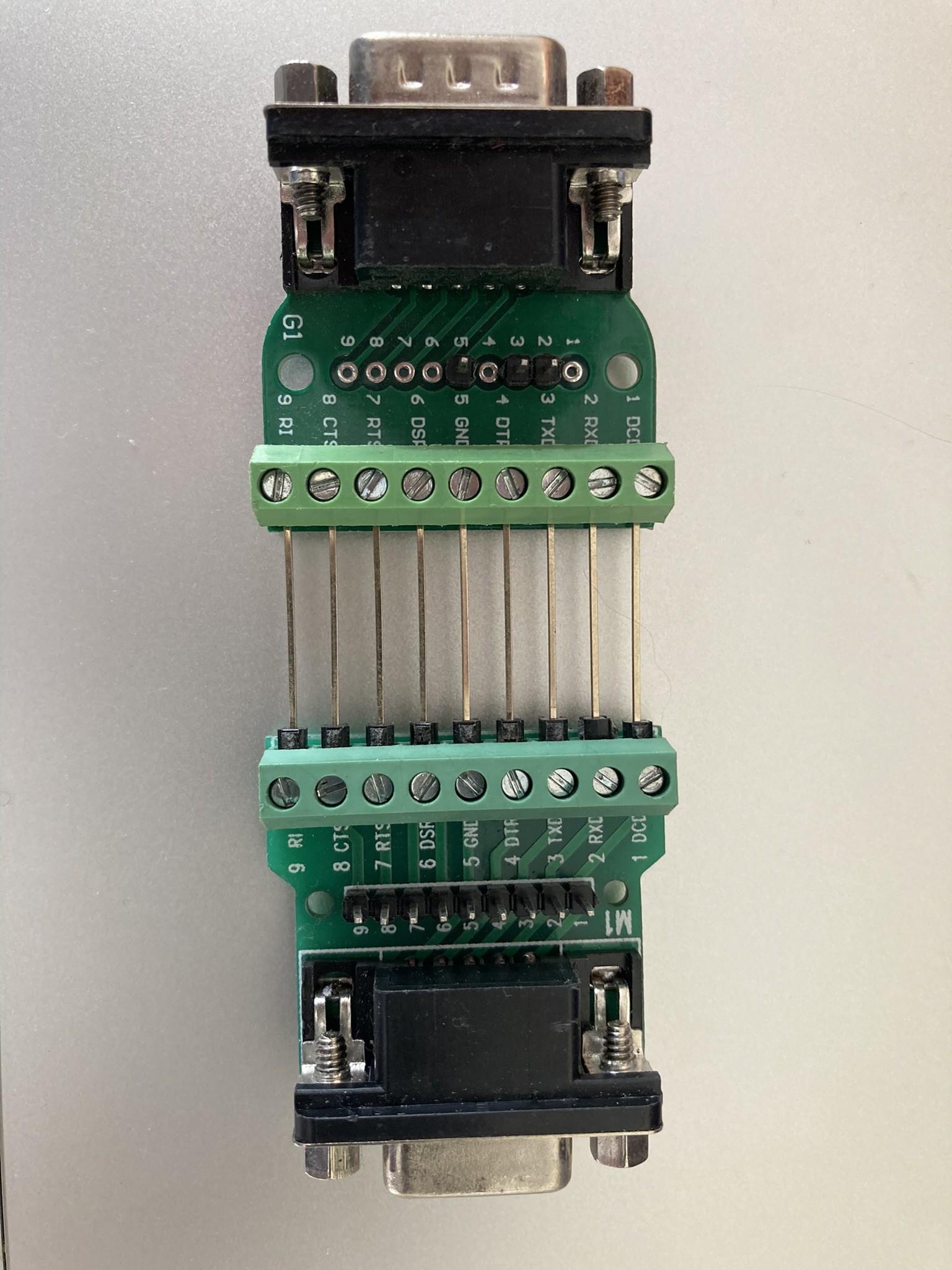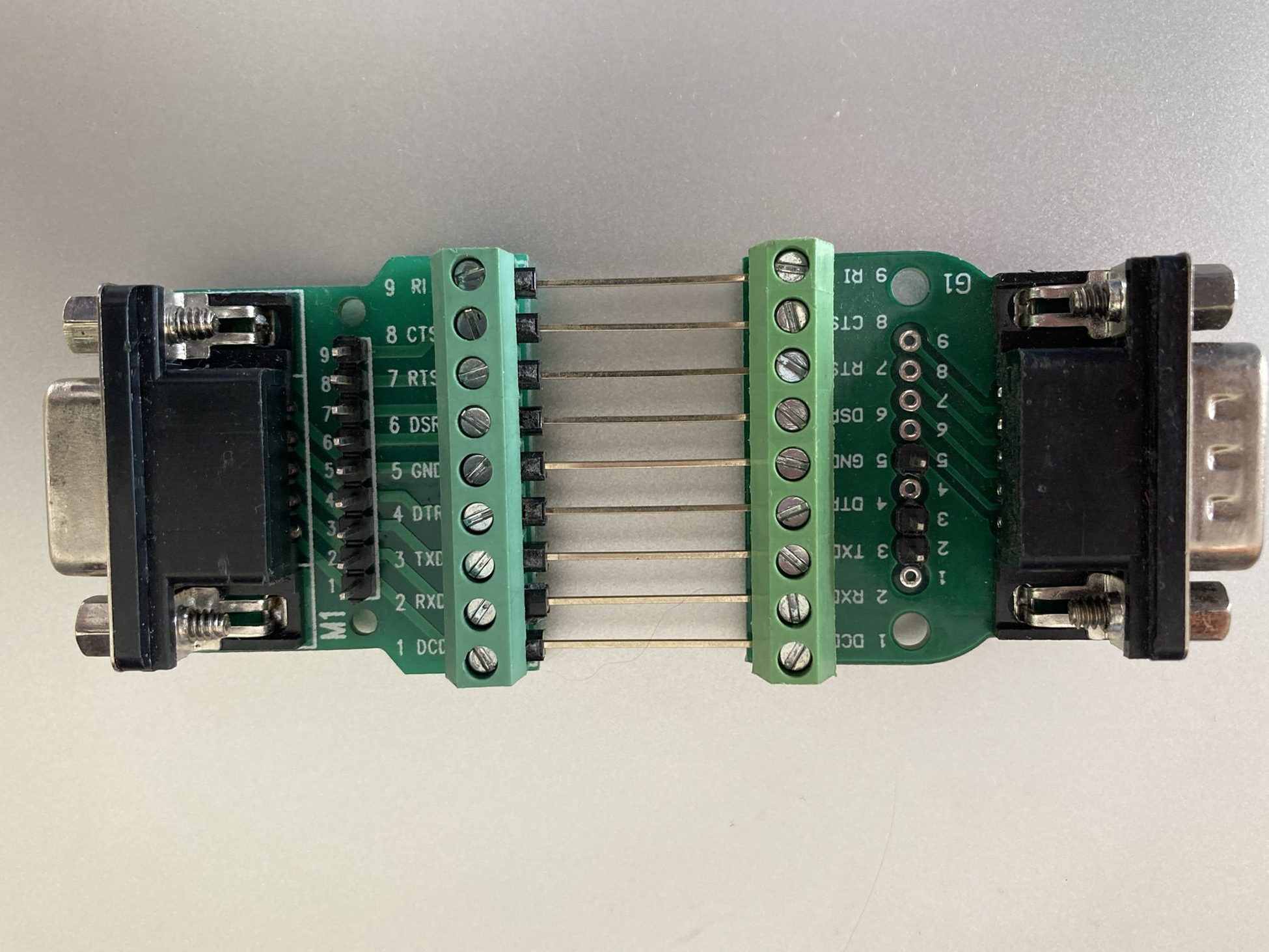 In order to expose the pins, I purchased two DE9 breakout boards, one with a female connector, and the other with a male connector. I then used some long header pins to connect them back to back, so that each signal was connected straight through. I also soldered some header pins to facilitate adding extra connections to the signals.