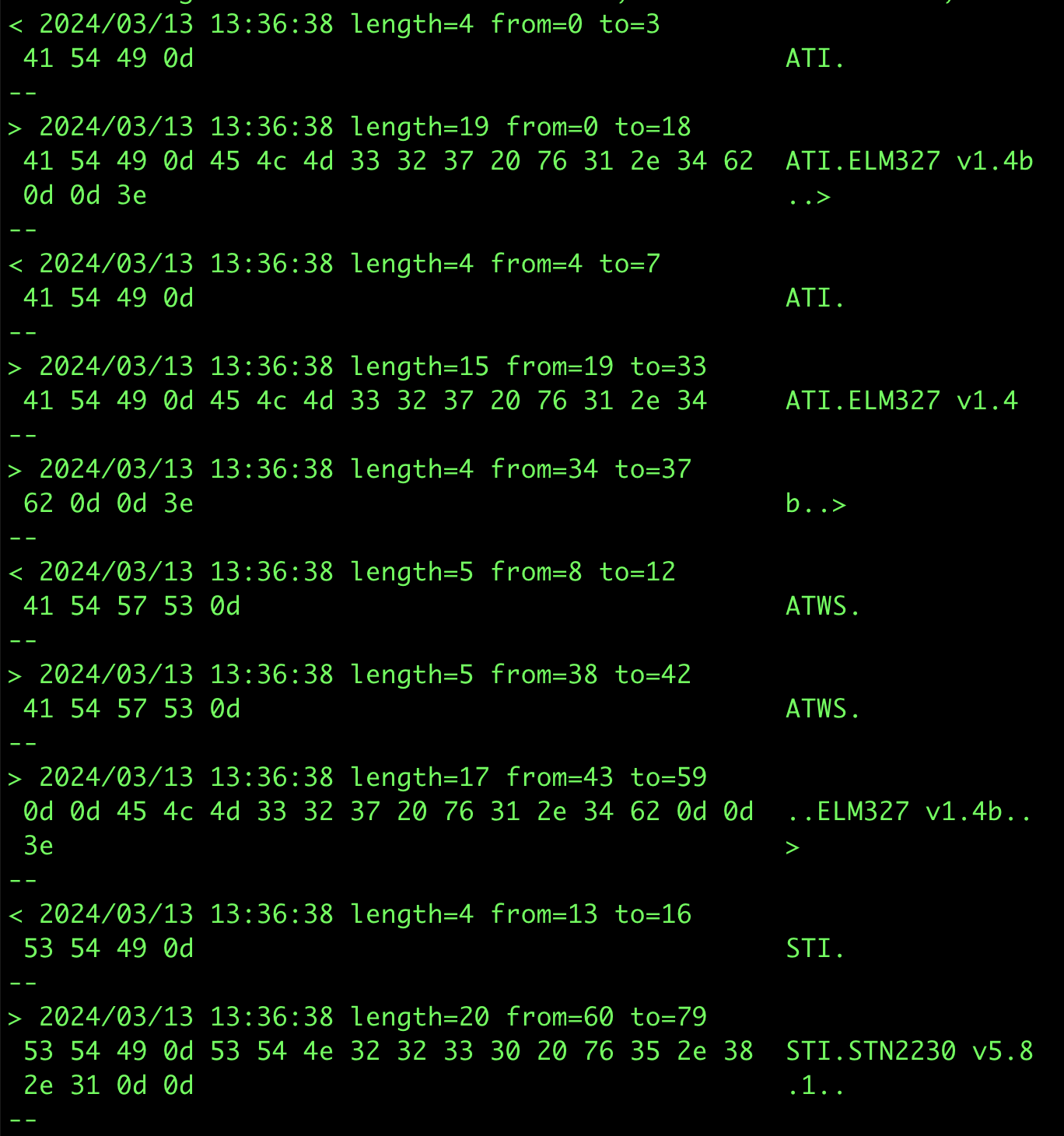 Breaking that down, socat is the swiss army knife of forwarders, and the -x option tells it to dump whatever it forwards in hex format. The two following arguments are the source and destination, in this case the device /dev/ttyUSB0 or ttyUSB1, doing no processing of the data (“raw”), and not echoing any data it receives to the original sender. (An echo can be useful for a cli, so the person typing can see what they have typed, but it is not useful for a machine that is not expecting it.) The hex dump output is then logged in serial.log where we can review it later, but also printed to the screen, so we can see that data is actually passing in both directions.