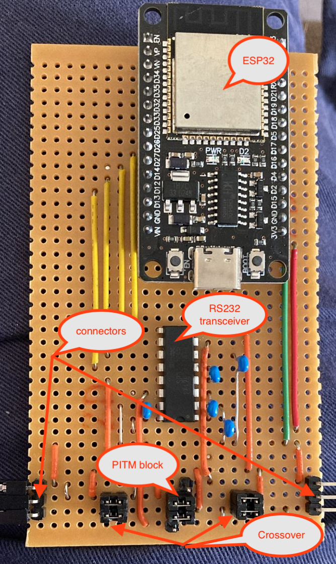 To select between Snoop or PitM, change the jumpers on the PitM block from horizontal to vertical, connecting to the additional pin adjacent to the block of 4 on either side. This pin is the TX from each serial port on the ESP32, via the RS232 transceiver, and allows the ESP32 to transmit something other than what was received.