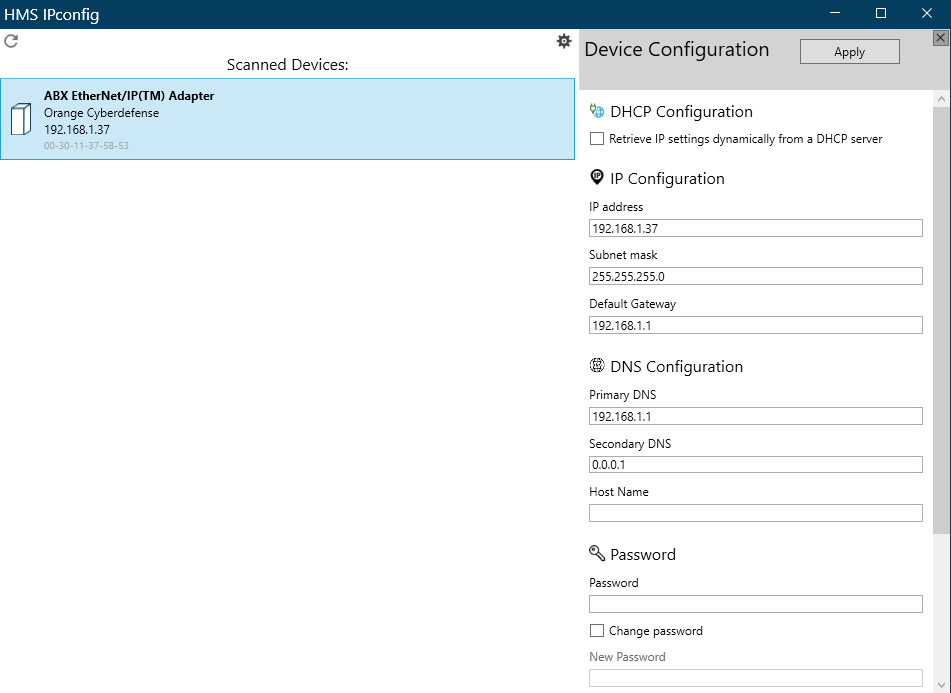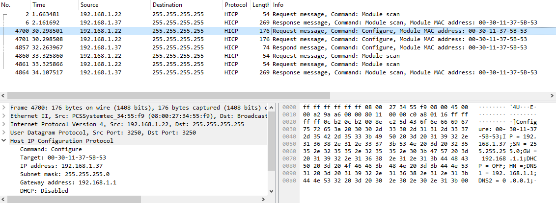 Capturing the traffic while using it, we observe that the requests are being sent to the port 3250/udp that we saw previously, using the protocol HICP. This is a proprietary protocol by HMS Networks primarily intended for devices’ IP network configuration. It is unencrypted, and supports authentication by setting a password, but authentication is disabled by default (by the way, I have never seen it enabled in real life). This means, at least, that: