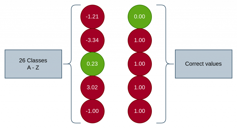 Cool, we have all this, and what happens if we run this for the first time – disappointment. There is no correction taking place so we have to implement a cost function. That would be the output layer being told what the correct class was supposed to be. Smaller numbers are the more correct classes.