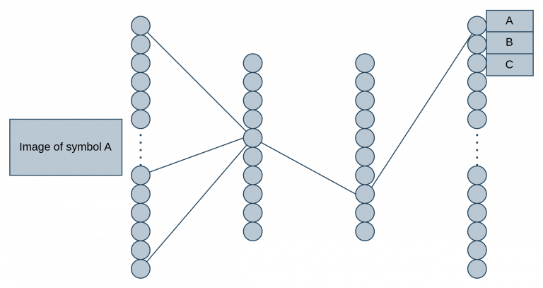Perspective; 784 neurons, 16×2 hidden layer neurons to an output layer of 26 classes. This is also simplified to the extreme. In reality this would have multiple connections for a single image to class and the connection weights will also play a factor (The lines are the connection weights and each line will have a value).