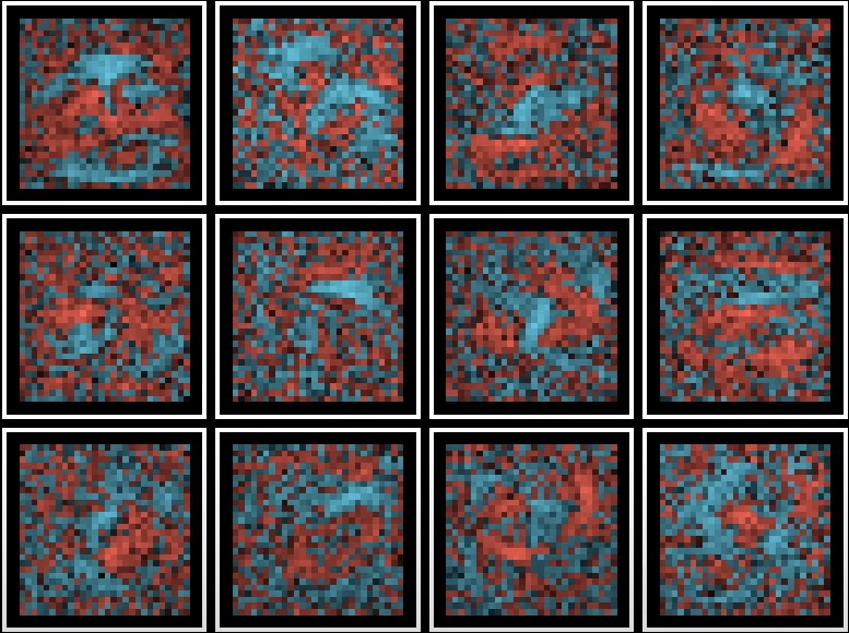 In the above you could think of it like this, the Symbol for A in Bill Cipher has certain characteristics. We would see a circle, straight line and an oval. Think of the hidden layer as identifying the shapes that make up the image. Multiple connections exist to do this, which in the end points to the most likely value in the output layer. This is of course simplified to the extreme. The “shapes” in question would look more like this, where every colour is the weight of the neuron: