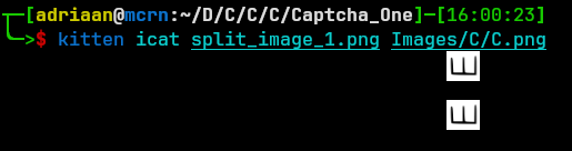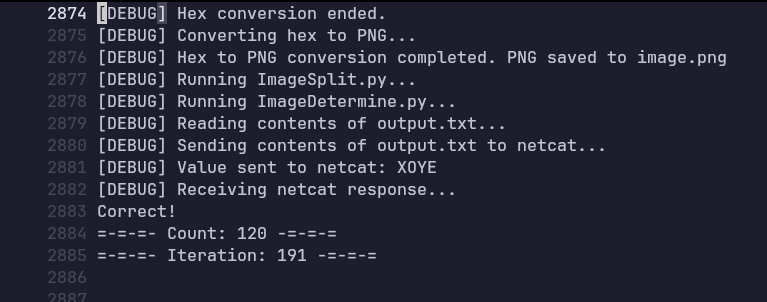 So with the 1:1 match, what’s left to do is have the script send the values of each split image to netcat and repeat the process 200 times, while, of course, combining the image results in a single four character code.