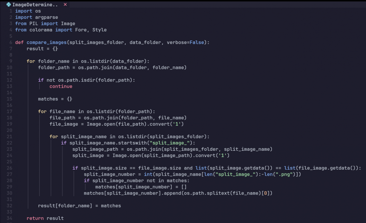 The compare_images function loops through each folder in my dataset. It takes these images and converts it to black and white, in case there isn’t any noise. It uses PIL to open each image then compares the size and pixel data to find a 1:1 match.