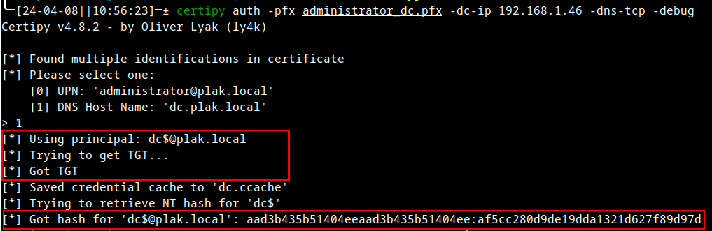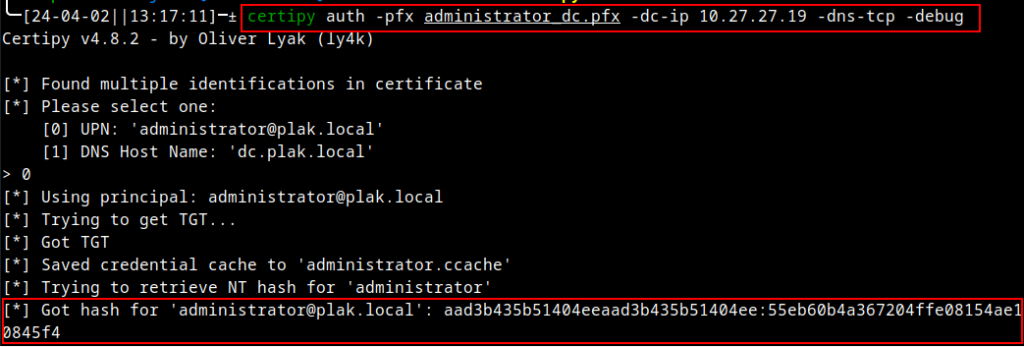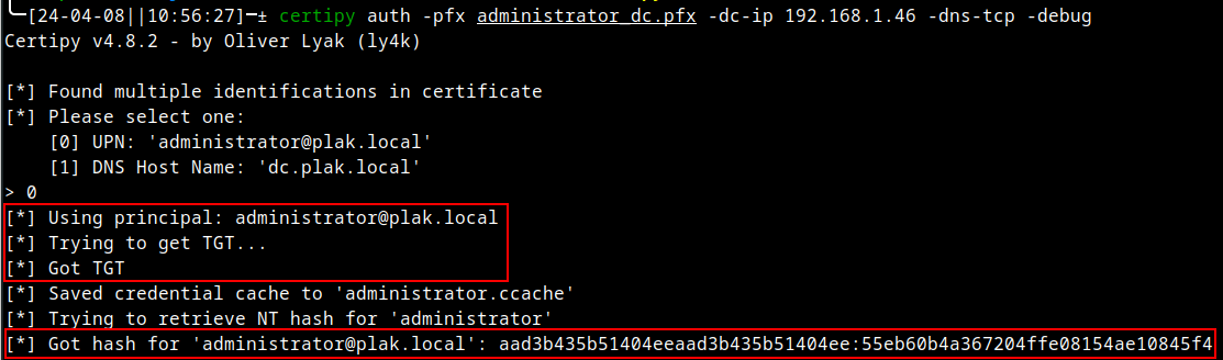 The question now turns to what happens when we attempt authentication against the Domain Controller with the issued certificate? In the below scenario, we are opting to use the certificate to authenticate against the Domain Administrator account (PLAK\administrator). This would classify as a valid client authentication attempt for the issued certificate. As such, we can get a valid TGT for the domain account and get its associated NTLM hash.