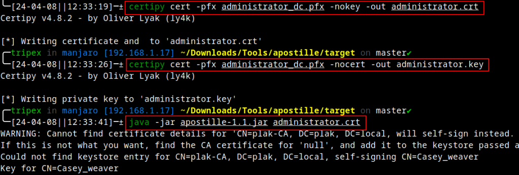 With the cloned certificate generated, we convert the PEM formatted certificate and key back to a PFX using OpenSSL: