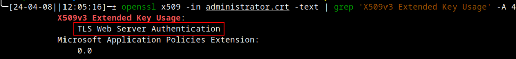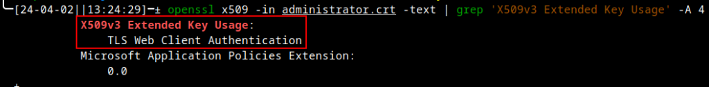 This then brings us to an important point for AD CS abuse: The certificate we generate as part of the ESC1 sequence must have client authentication in its EKU. Without it, we won’t be able to authenticate to the KDC and cannot generate the TGT and TGS we require.