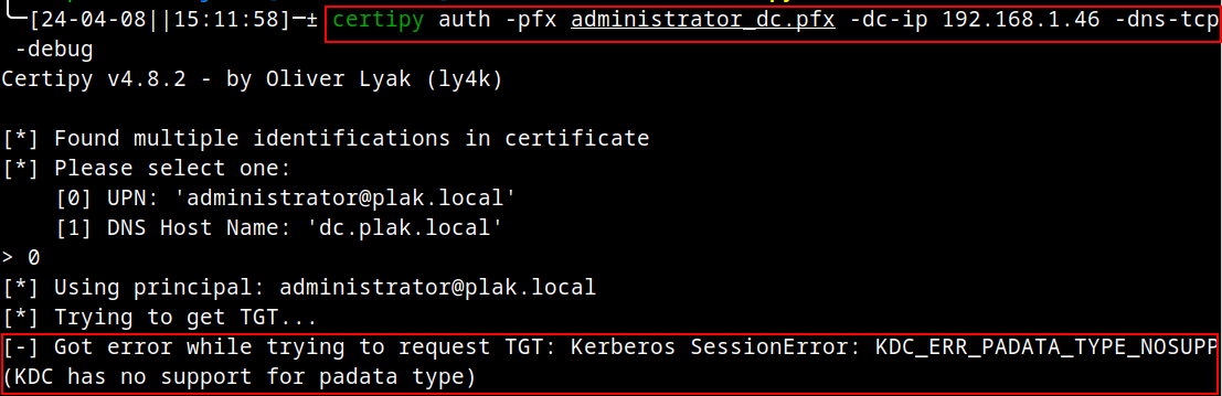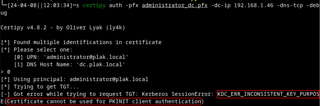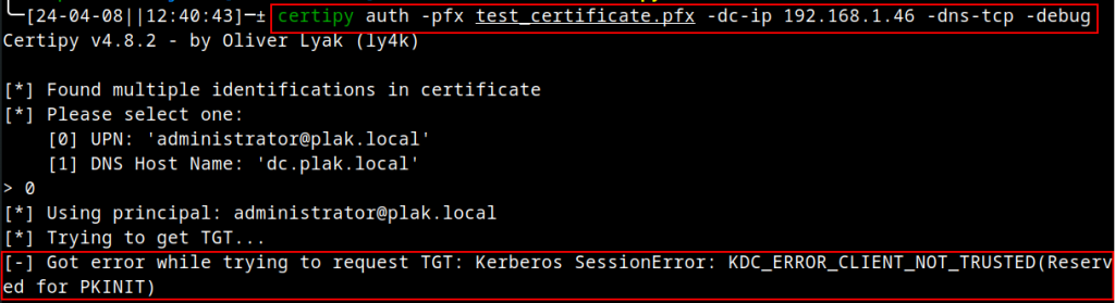While a valid client authentication certificate has now been issued, the more pressing question is whether it could still be used. Let’s pass this certificate to the KDC while requesting a TGT as the Domain Administrator account:
