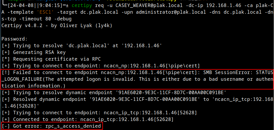 Tooling such as Certify and certipy have evolved to provide more descriptive error messages lately. Yet, they still leave a lot to be desired. Often, when you encounter an error with these tools, it’s somewhat ambiguous and unclear what caused it. Is it one of the many flags I mistyped, the domain credentials I got the syntax wrong, or am I not correctly connecting to the CA server? Add in the complexity of remote testing via a VPN and SOCKS proxy, and you are in a world of hurt trying to diagnose what is going wrong.