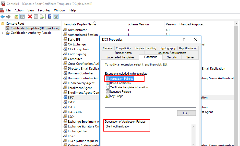 It is important to note that the certificate template (ESC1) has been configured for client authentication only: