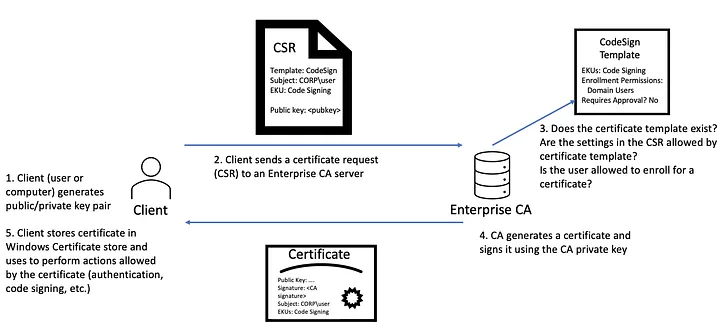 In Will Schroeder and Lee Christensen’s original AD CS whitepaper, they share the below diagram that showcases how the process of generating a certificate is accomplished: