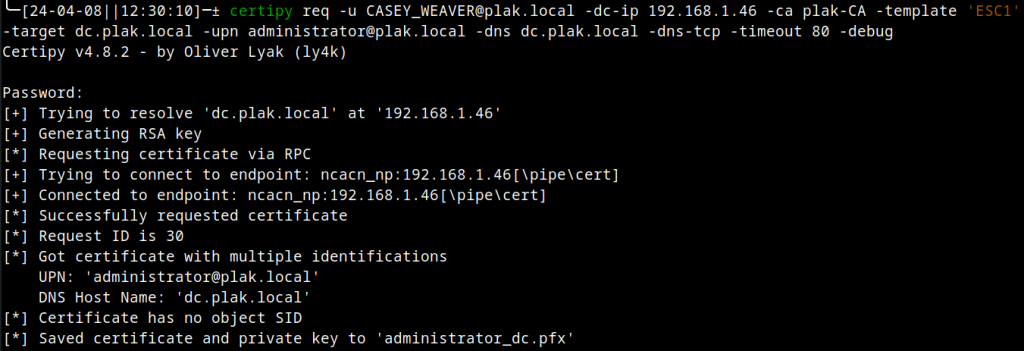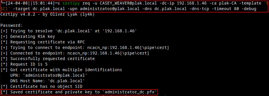 In the following example, we are attempting to abuse an ESC1-based certificate template. We start by raising a CSR to the CA server using the certipy tool: