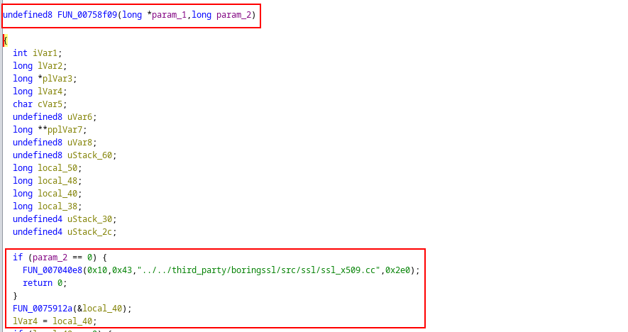 Unfortunately, identifying the function turned into quite the exercise. Remember the libflutter.so file is stripped, which means no symbols are available. For example, this is the output Ghidra showed when navigating to a cross-reference of the ssl_x509.cc file: