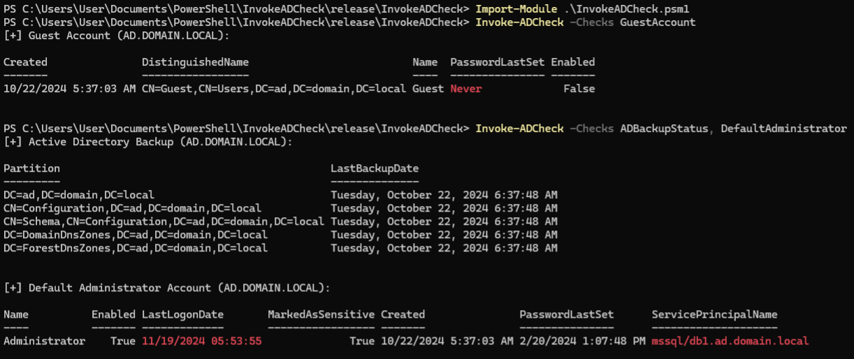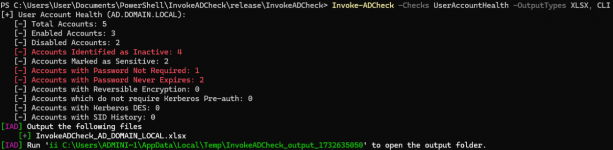 Once the InvokeADCheck module completes its execution, it highlights various unsafe or default settings and configurations in red for easy identification. The results are displayed in the CLI by default, but you can also redirect the output to various file types, allowing you to save your findings or further process the data as needed.