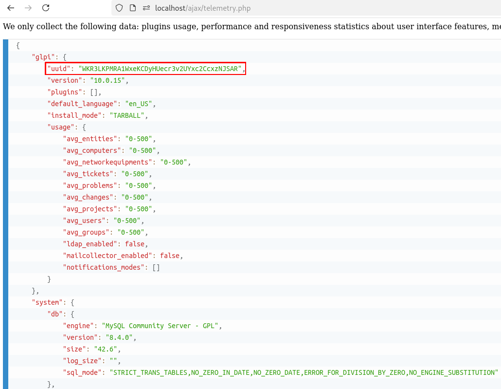 During previous GLPI research I was looking for the registration token present in the telemetry. This token is generated at install and used to identify the software instance. It is also stored in a database.