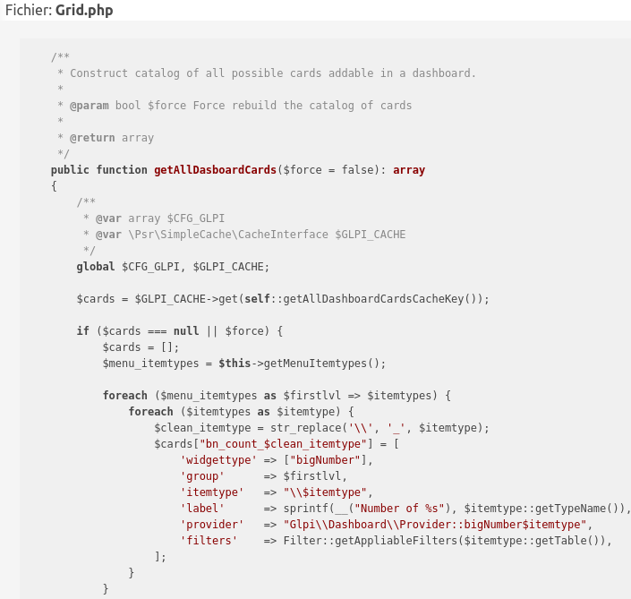 The widget class is coded in this file: src/Dashboard/Widget.php. By taking a look at it we can find a lot of static functions available to render different widgets (pie, half-pie, donut, bar, numbers…). At first I started taking a look at a widget that creates a link with the database. This widget is a search widget that allows user to display database information such as Tickets in use. However this widget, despite its ability to retrieve some information, does not allow for a direct compromise. So I took a step back, and went for another widget.