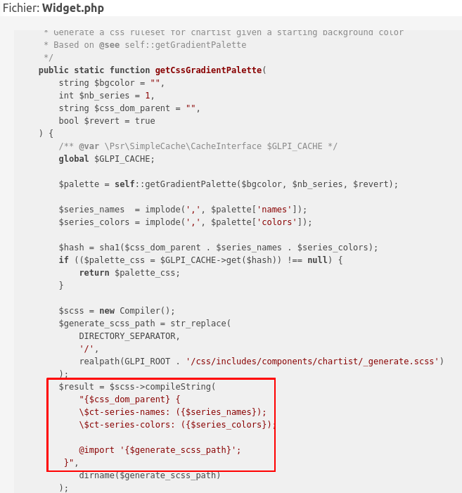 At this point, I did not know what to look for, there are only style related functions in this class. Anyway, never give up, I continue to look into the source. I found that some widgets are styled dynamically. By going deeper into this rendering process, I saw that SCSS was used in order to return CSS of some widget. And what was interesting is that we control some arguments of the template!