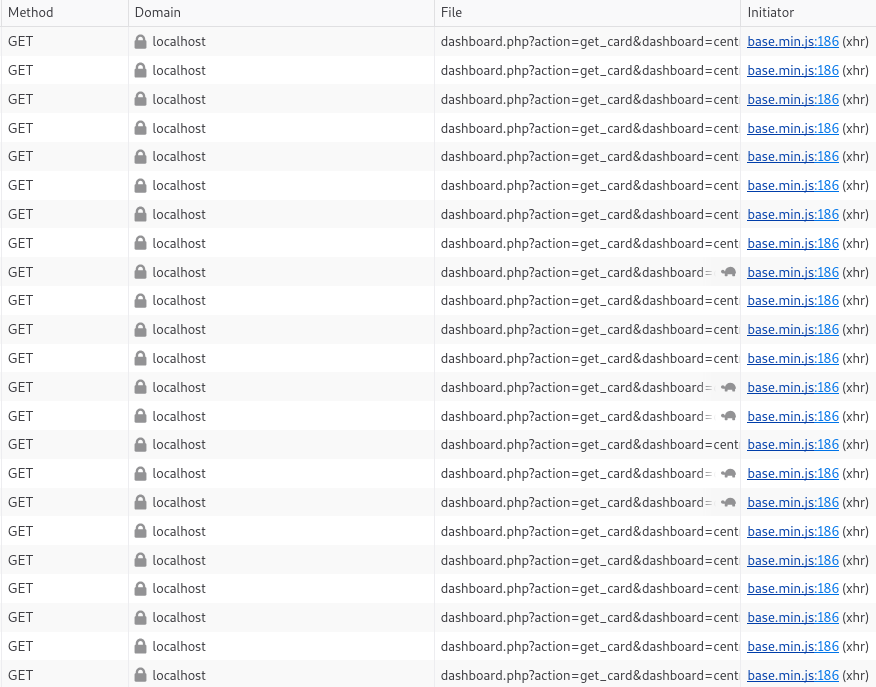 In fact, the dashboard is dynamic; it is an arrangement of cards that are known as Widgets within GLPI. So each card is made dynamically, and then it is returned and placed to create a dashboard. Here is an example of outgoing requests for generating a dashboard: