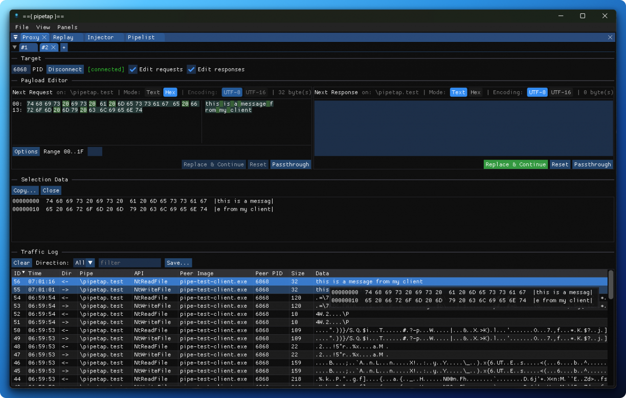 The pipe client also has a “remote client” feature. To understand this, you need to know that by default, if you connect the named pipe client, the source process making the named pipe connection will be the pipetap GUI. In the remote client case, connections come out of another process (i.e., not the GUI). To achieve this you need to start by injecting the support DLL into a remote process. Then you connect to your desired named pipe using the named pipe client by also specifying the PID of the injected process. In this configuration, the pipetap GUI will use the support DLL to initiate the named pipe connection instead of the GUI itself. This means that the named pipe server receiving the connection will think the other process initiated the client connection and not the pipetap GUI. This remote client feature has been particularly useful in cases where some hardened named pipe servers do what I’m just calling “calling PID validation”. That is, the server asks for the PID of the connecting process and does some security checks (i.e., code signature validation of the backing PE, etc.).