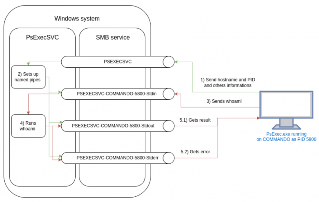 Now we understand that the psexecsvc named pipe is here to receive information that will be used to create the other three named pipes. Schematically, we can say that PsExec.exe creates named pipes this way: