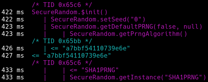 Furthermore, I couldn’t find a nice way, using frida-trace, to overwrite the behaviour of the toString method of certain objects, such as byte[] or javax.crypto.spec.SecretKeySpec. I’m sure there is a way – I’m still looking.